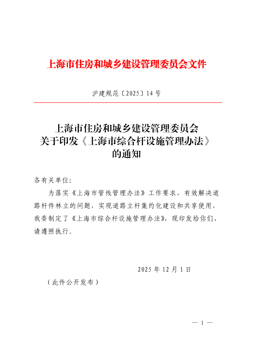 关于印发《上海市综合杆设施管理办法》的通知 ( 2026-01-01 )