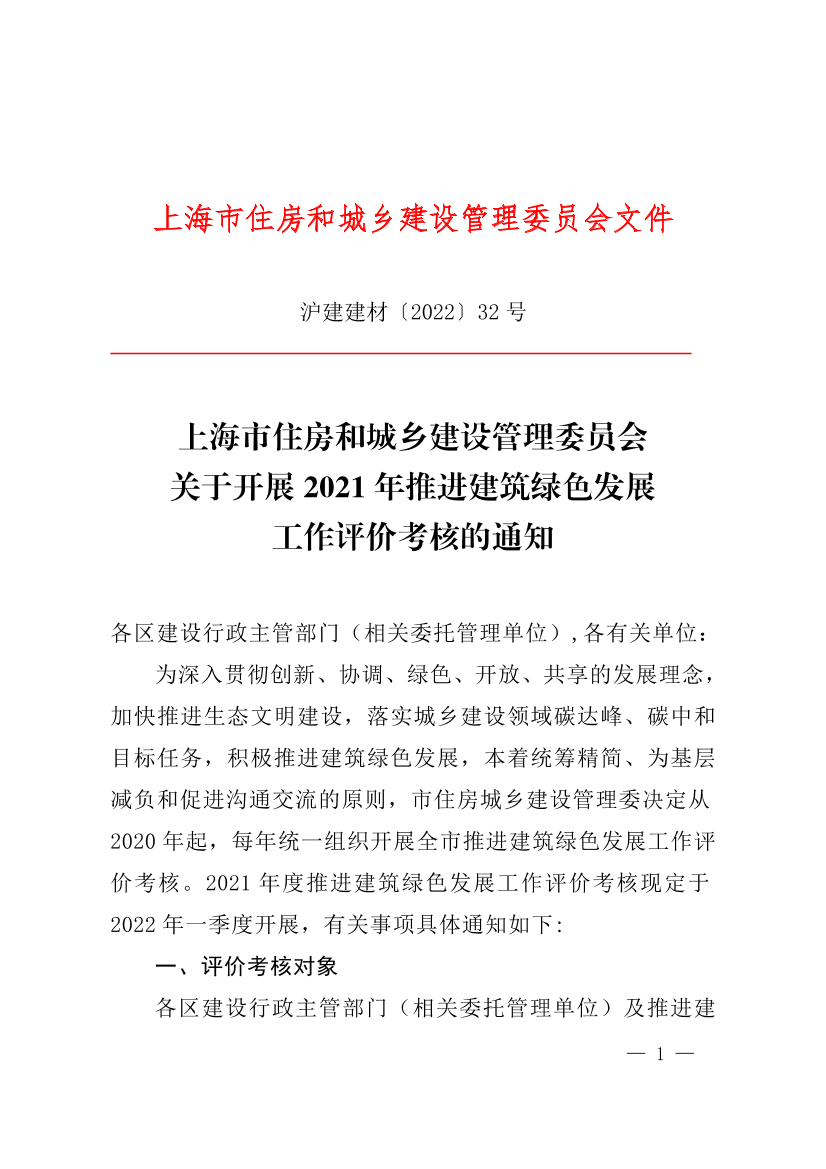 为深入贯彻创新、协调、绿色、开放、共享的发展理念,加快推进生态文明建设,落实城乡建设领域碳达峰、碳中和目标任务,积极推进建筑绿色发展,本着统筹精简、为基层减负和促进沟通交流的原则,市住房城乡建设管理委决定从2020年起,每年统一组织开展全市推进建筑绿色发展工作评价考核。2021年度推进建筑绿色发展工作评价考核现定于2022年一季度开展,有关事项具体通知如下: