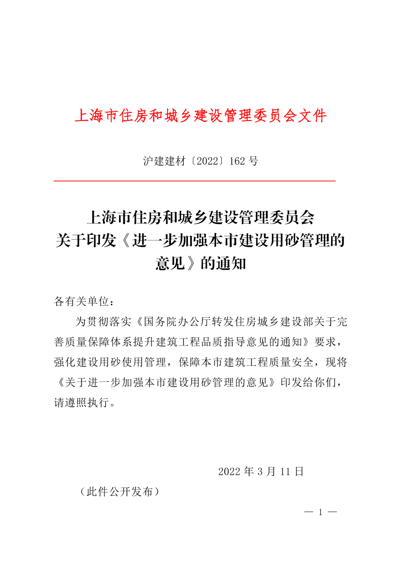 关于印发《进一步加强本市建设用砂管理的意见》的通知 ( 2022-03-12 )