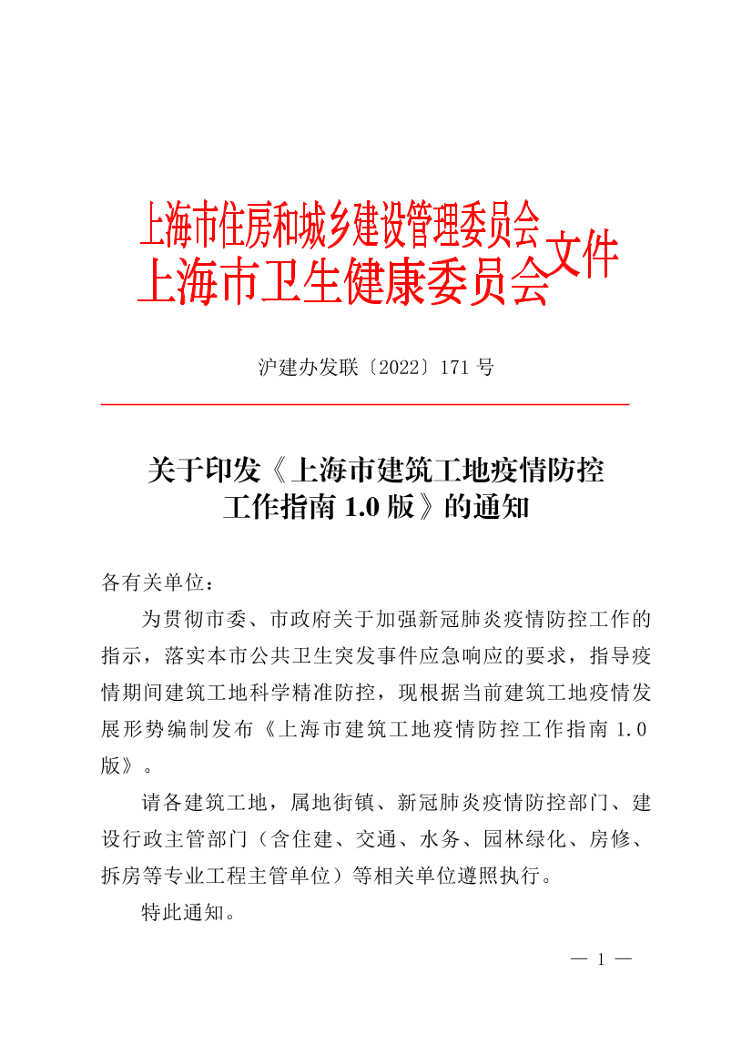 关于印发《上海市建筑工地疫情防控工作指南1.0 版》的通知