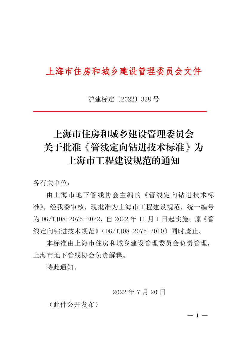 关于批准《管线定向钻进技术标准》为上海市工程建设规范的通知 ( 2022-07-21 )