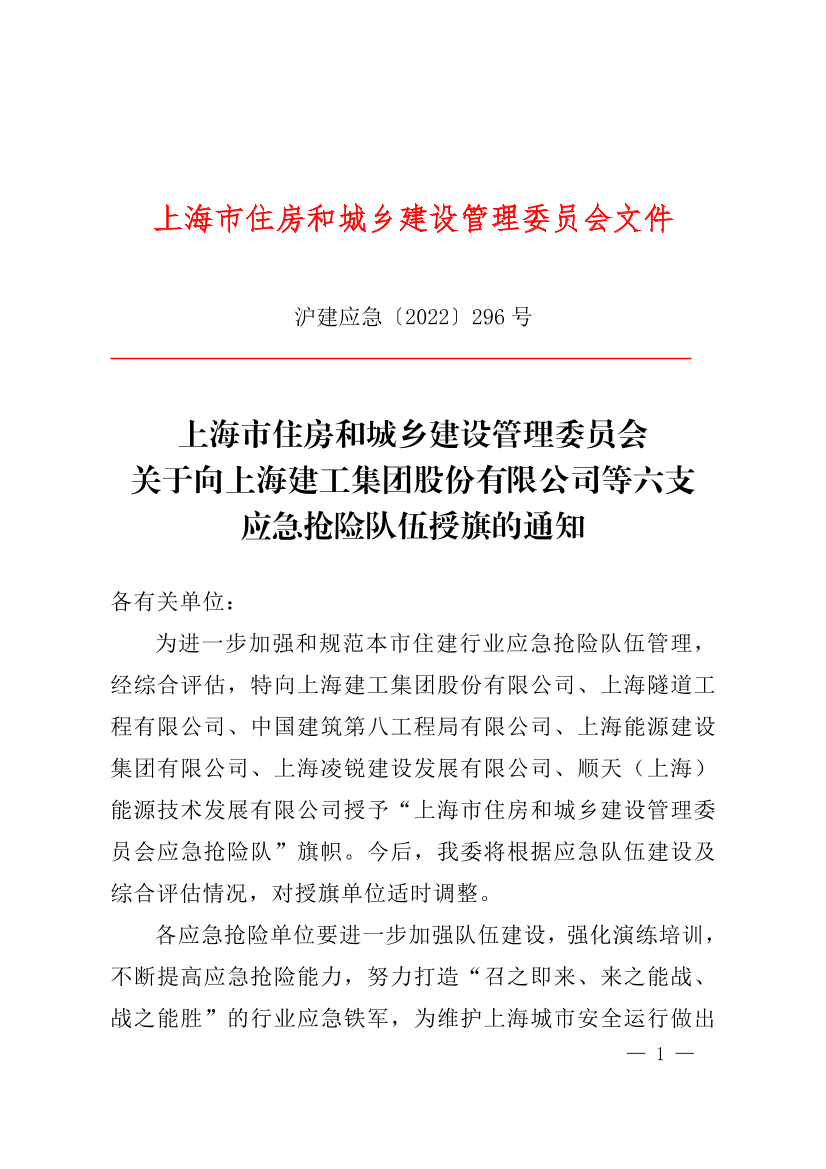 为进一步加强和规范本市住建行业应急抢险队伍管理,经综合评估,特向上海建工集团股份有限公司、上海隧道工程有限公司、中国建筑第八工程局有限公司、上海能源建设集团有限公司、上海凌锐建设发展有限公司、顺天(上海)能源技术发展有限公司授予“上海市住房和城乡建设管理委员会应急抢险队”旗帜。今后,我委将根据应急队伍建设及综合评估情况,对授旗单位适时调整。
