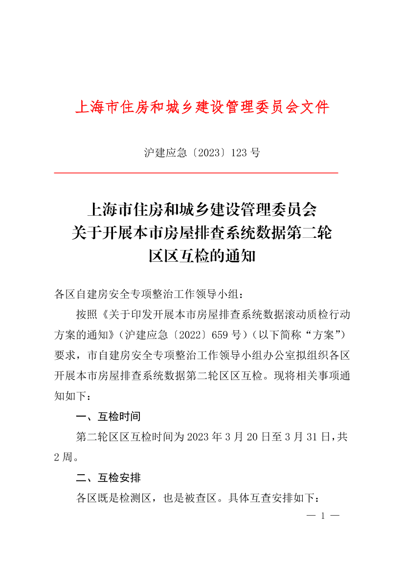 关于开展本市房屋排查系统数据第二轮区区互检的通知 ( 2023-03-14 )