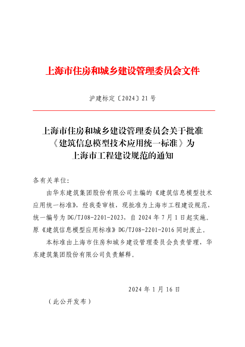 由华东建筑集团股份有限公司主编的《建筑信息模型技术应用统一标准》,经我委审核,现批准为上海市工程建设规范,统一编号为DG/TJ08-2201-2023,自2024年7月1日起实施。原《建筑信息模型应用标准》DG/TJ08-2201-2016同时废止。