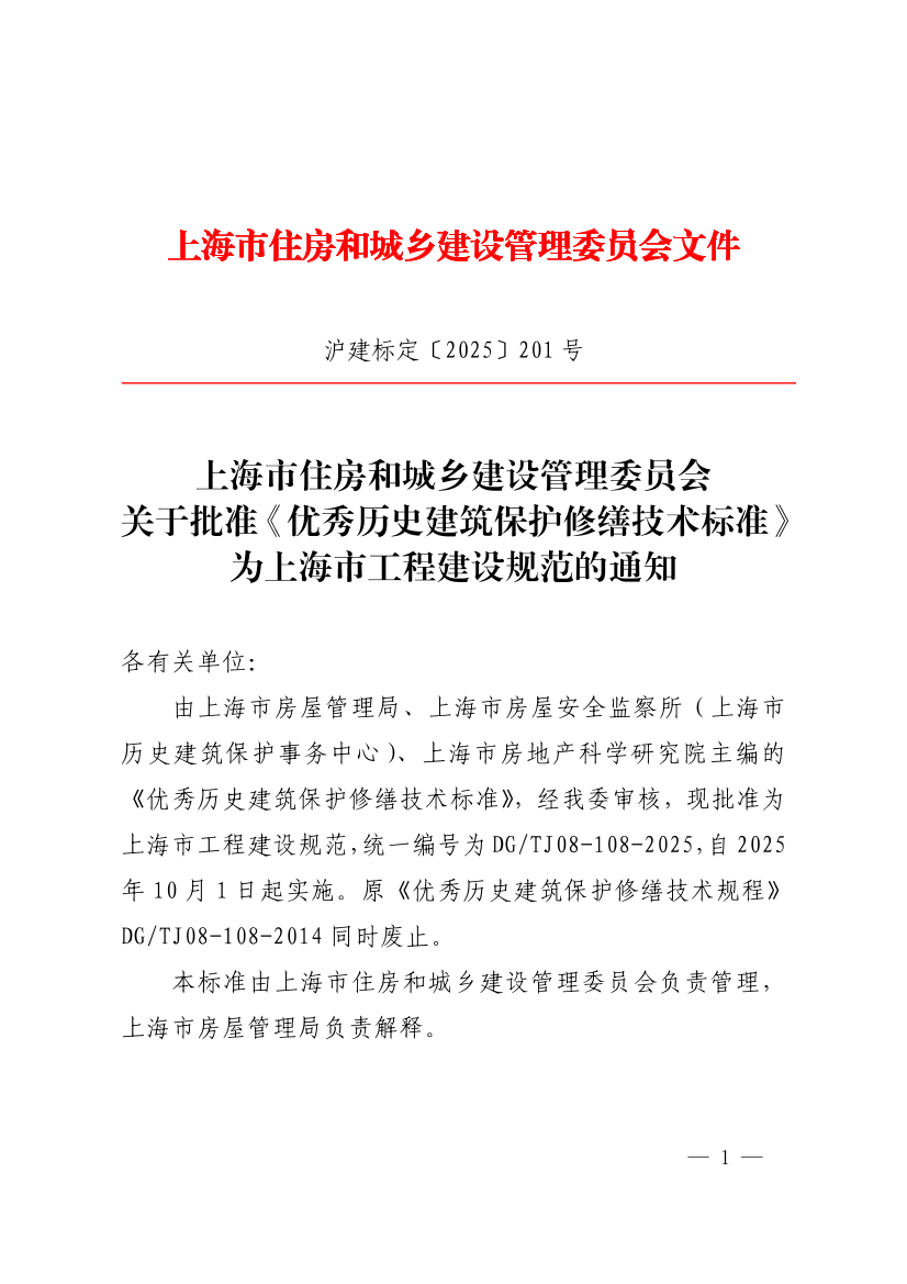 由上海市房屋管理局、上海市房屋安全监察所(上海市历史建筑保护事务中心)、上海市房地产科学研究院主编的《优秀历史建筑保护修缮技术标准》,经我委审核,现批准为上海市工程建设规范,统一编号为DG/TJ08-108-2025,自2025年10月1日起实施。原《优秀历史建筑保护修缮技术规程》DG/TJ08-108-2014同时废止。