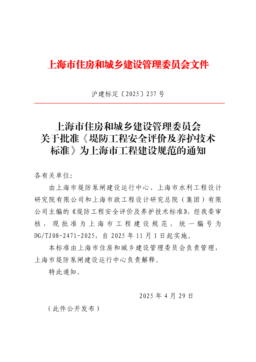由上海市堤防泵闸建设运行中心、上海市水利工程设计研究院有限公司和上海市政工程设计研究总院(集团)有限公司主编的《堤防工程安全评价及养护技术标准》,经我委审核,现批准为上海市工程建设规范,统一编号为DG/TJ08-2471-2025,自2025年11月1日起实施。