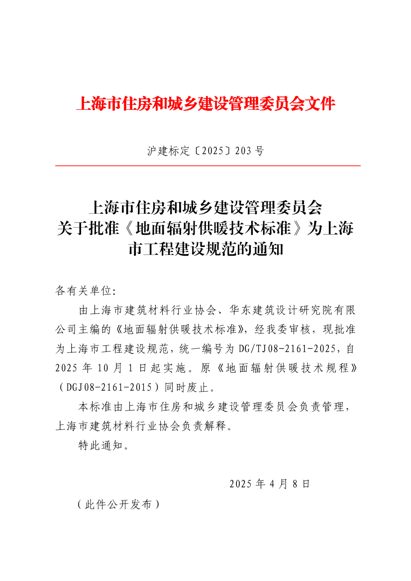 由上海市建筑材料行业协会、华东建筑设计研究院有限公司主编的《地面辐射供暖技术标准》,经我委审核,现批准为上海市工程建设规范,统一编号为DG/TJ08-2161-2025,自2025年10月1日起实施。原《地面辐射供暖技术规程》(DGJ08-2161-2015)同时废止。