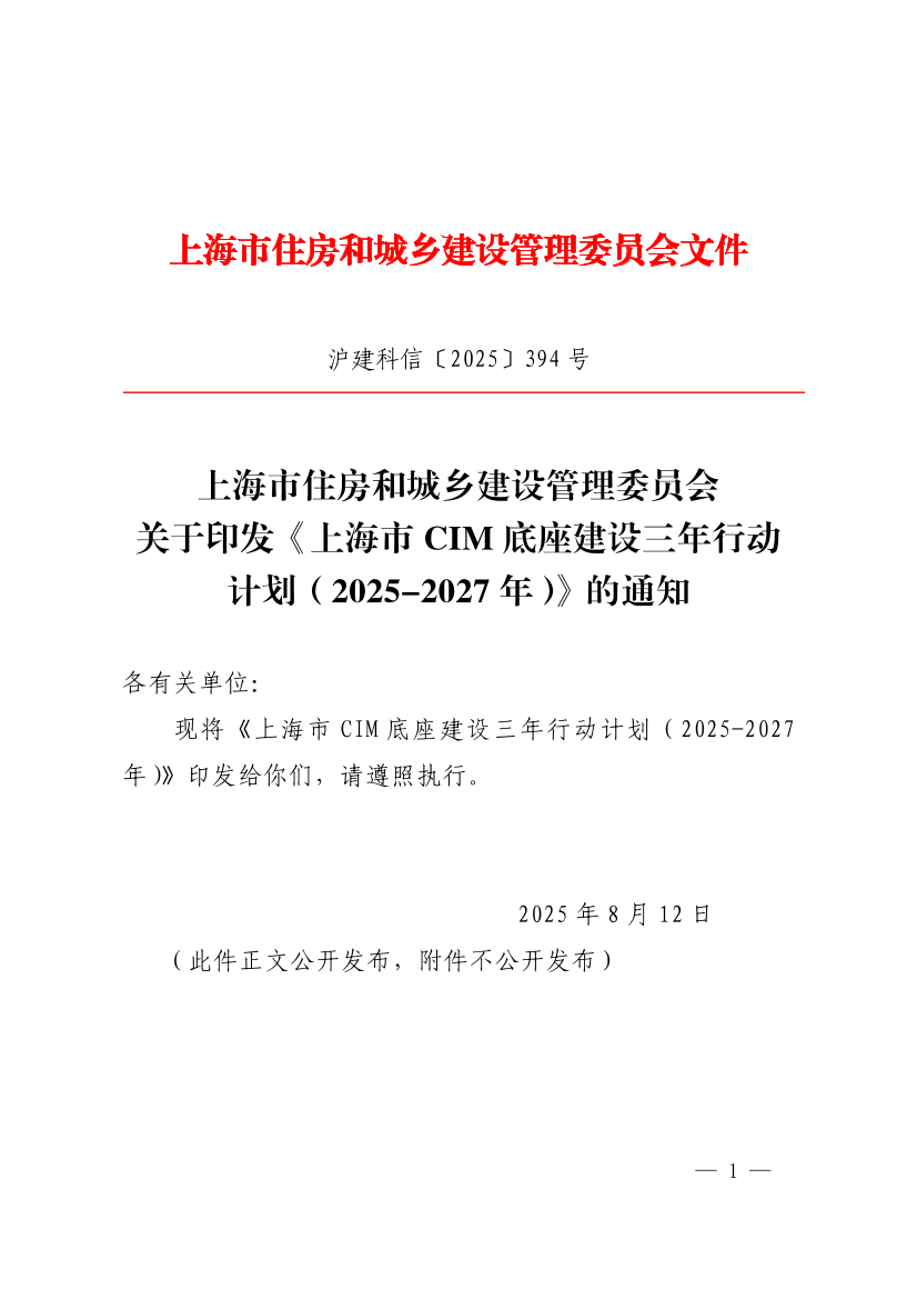 关于印发《上海市CIM底座建设三年行动计划(2025-2027年)》的通知 ( 2025-08-13 )