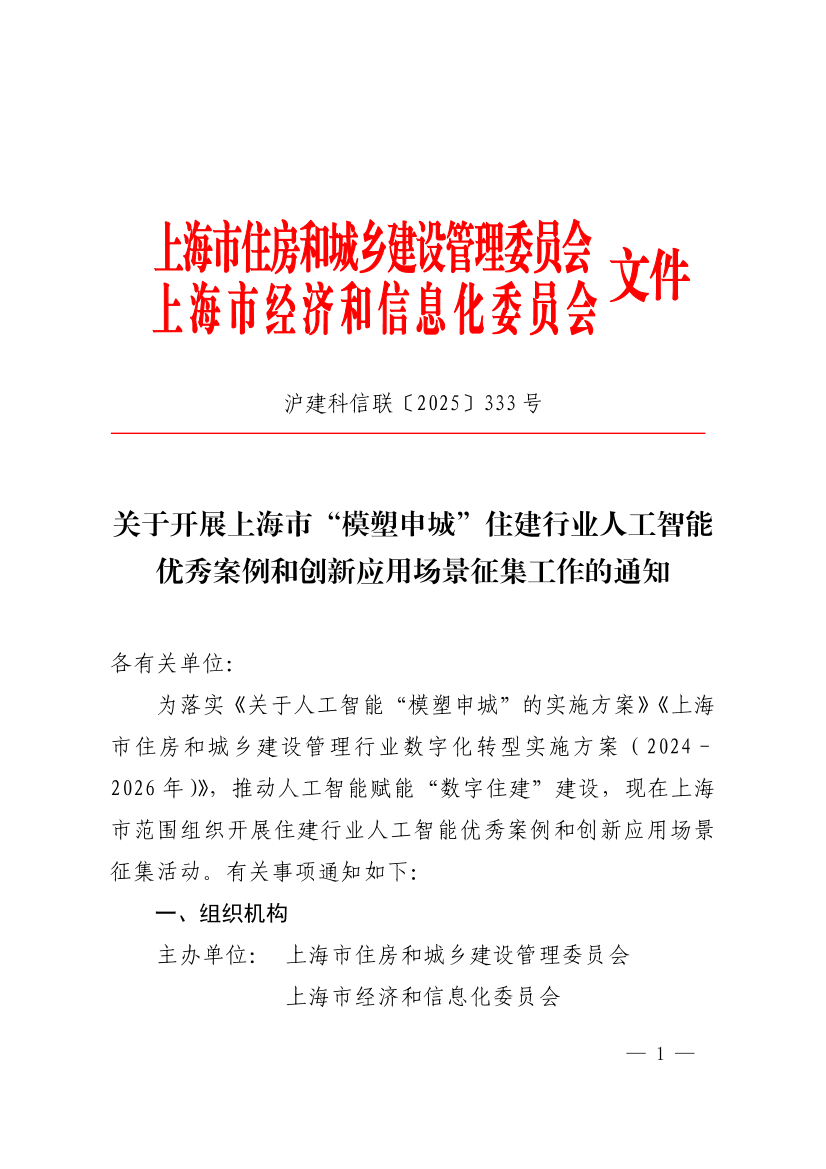关于开展上海市“模塑申城”住建行业人工智能优秀案例和创新应用场景征集工作的通知 ( 2025-07-22 )