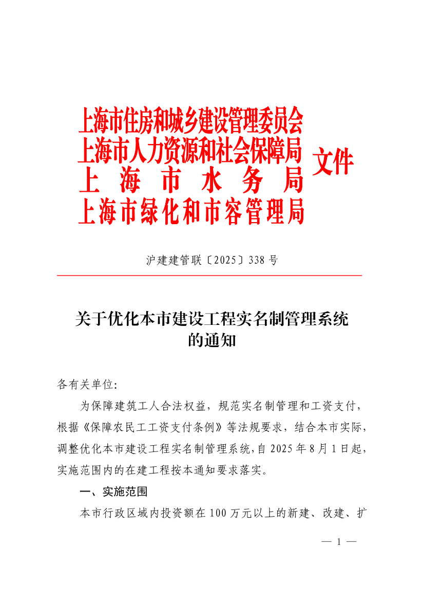 为保障建筑工人合法权益,规范实名制管理和工资支付,根据《保障农民工工资支付条例》等法规要求,结合本市实际,调整优化本市建设工程实名制管理系统,自2025年8月1日起,实施范围内的在建工程按本通知要求落实。