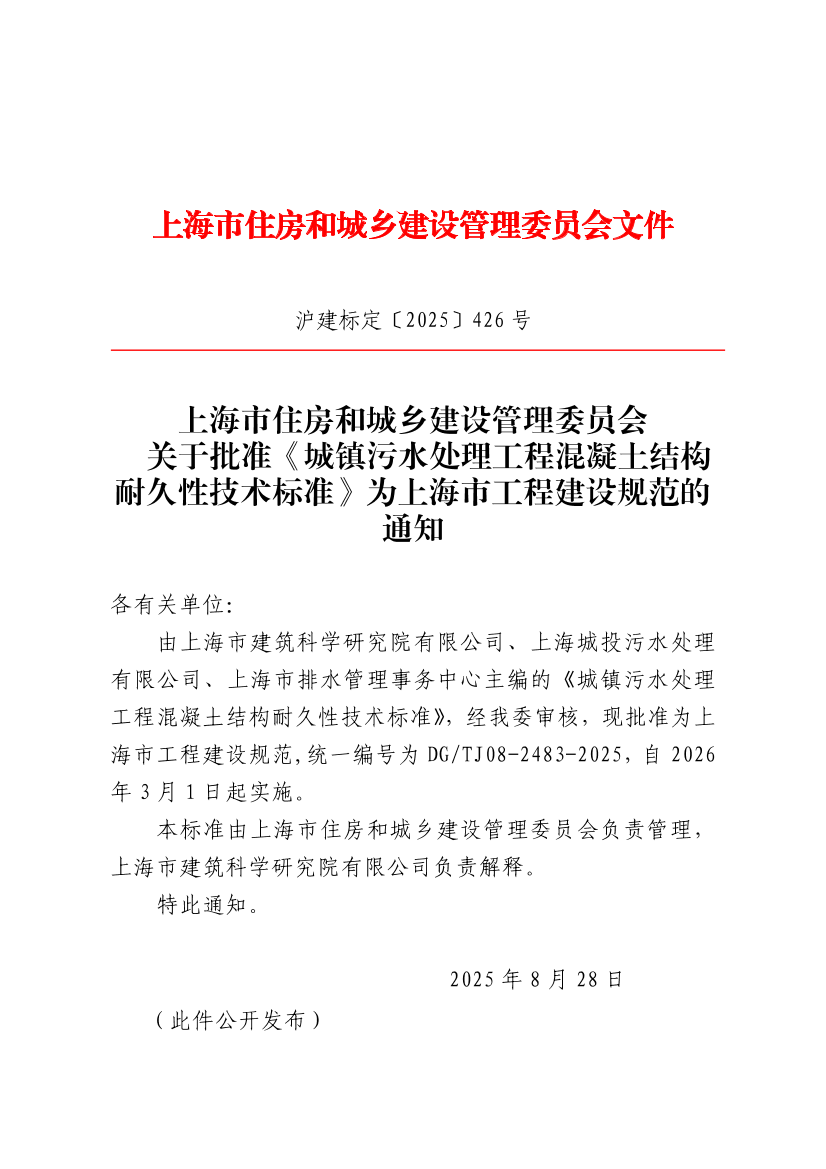 由上海市建筑科学研究院有限公司、上海城投污水处理有限公司、上海市排水管理事务中心主编的《城镇污水处理工程混凝土结构耐久性技术标准》,经我委审核,现批准为上海市工程建设规范,统一编号为DG/TJ08-2483-2025,自2026年3月1日起实施。