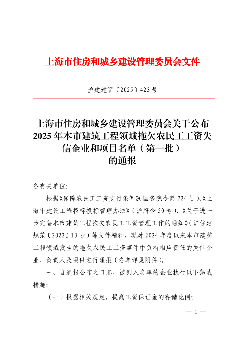 根据《保障农民工工资支付条例》(国务院令第724号)、《上海市建设工程招标投标管理办法》(沪府令50号)、《关于进一步完善本市建筑工程拖欠农民工工资管理工作的通知》(沪住建规范〔2022〕13号)等文件精神,现对2024年度以来本市建筑工程领域发生的拖欠农民工工资事件中负有相应责任的失信企业、负责人及项目进行通报(名单详见附件)。