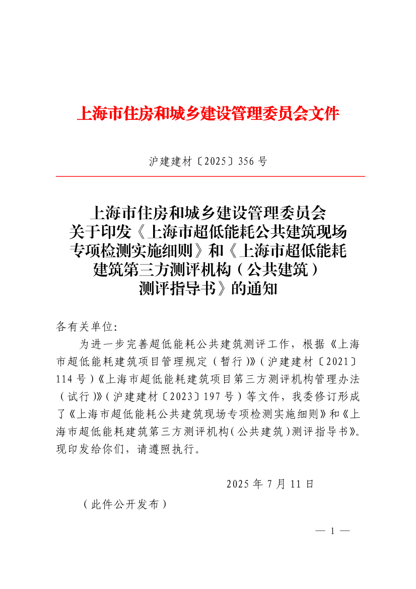 关于印发《上海市超低能耗公共建筑现场专项检测实施细则》和《上海市超低能耗建筑第三方测评机构(公共建筑)测评指导书》的通知 ( 2025-09-25 )