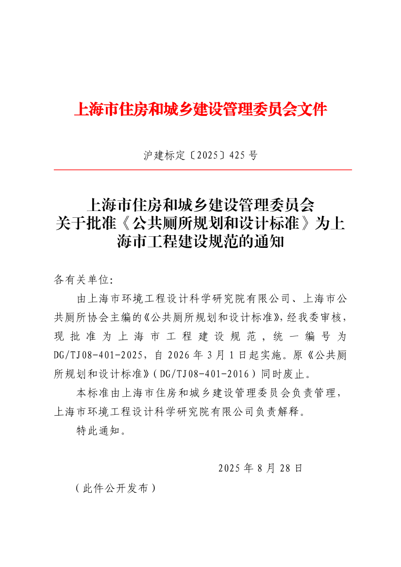 由上海市环境工程设计科学研究院有限公司、上海市公共厕所协会主编的《公共厕所规划和设计标准》,经我委审核,现批准为上海市工程建设规范,统一编号为DG/TJ08-401-2025,自2026年3月1日起实施。原《公共厕所规划和设计标准》(DG/TJ08-401-2016)同时废止。