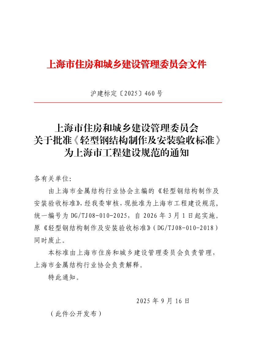 由上海市金属结构行业协会主编的《轻型钢结构制作及安装验收标准》,经我委审核,现批准为上海市工程建设规范,统一编号为DG/TJ08-010-2025,自2026年3月1日起实施。原《轻型钢结构制作及安装验收标准》(DG/TJ08-010-2018)同时废止。