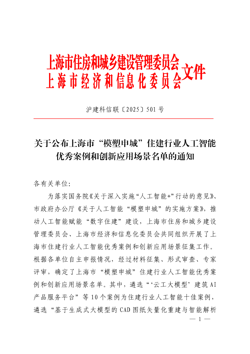 为落实国务院《关于深入实施“人工智能+”行动的意见》、市政府办公厅《关于人工智能“模塑申城”的实施方案》,推动人工智能赋能“数字住建”建设,上海市住房和城乡建设管理委员会、上海市经济和信息化委员会共同组织开展了上海市住建行业人工智能优秀案例和创新应用场景征集工作。根据各单位自主申报情况,经过材料征集、形式审查、专家评审,确定了上海市“模塑申城”住建行业人工智能优秀案例和创新应用场景名单。其中,遴选“‘云工大模型’建筑AI产品服务平台”等10个案例为住建行业人工智能十佳案例,遴选“基于生成式大模型的CAD图纸矢量化重建与智能解析平台”等10个场景为住建行业人工智能十佳场景。现将上海市“模塑申城”住建行业人工智能优秀案例和创新应用场景名单予以公布(详见附件)。