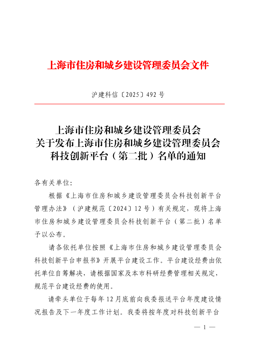 关于发布上海市住房和城乡建设管理委员会科技创新平台(第二批)名单的通知 ( 2025-11-17 )