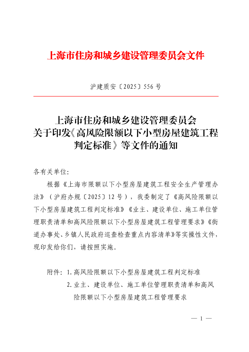 关于印发《高风险限额以下小型房屋建筑工程判定标准》等文件的通知 ( 2025-12-23 )