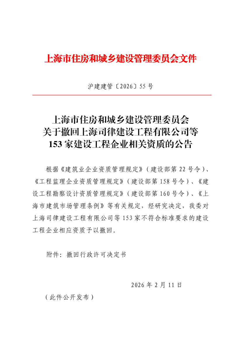 关于撤回上海司律建设工程有限公司等153家建设工程企业相关资质的公告 ( 2026-02-12 )