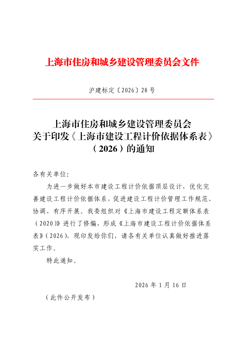 关于印发《上海市建设工程计价依据体系表》(2026)的通知 ( 2026-01-17 )