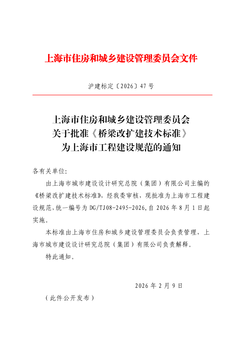 由上海市城市建设设计研究总院(集团)有限公司主编的《桥梁改扩建技术标准》,经我委审核,现批准为上海市工程建设规范,统一编号为DG/TJ08-2495-2026,自2026年8月1日起实施。